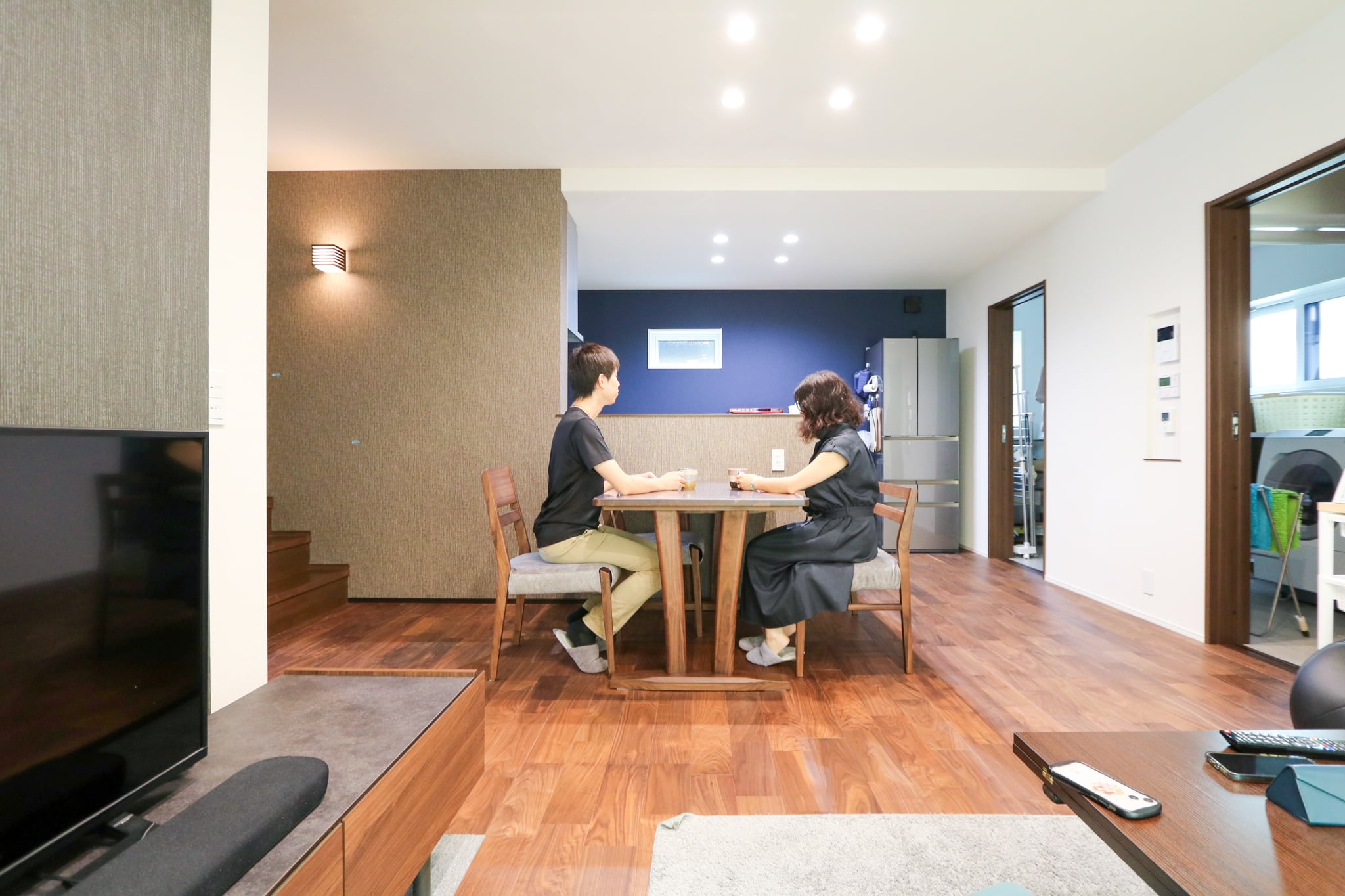 大迫力のスクリーンと臨場感あふれるサウンドで映画を見ると、好きな映画がより一層楽しめるます。奥様 : 床や建具の色を暗めにして落ち着いたモダンな雰囲気にしたことです。特にキッチンは収納スペースもたくさんあり、使い勝手も良くとても気に入っています。